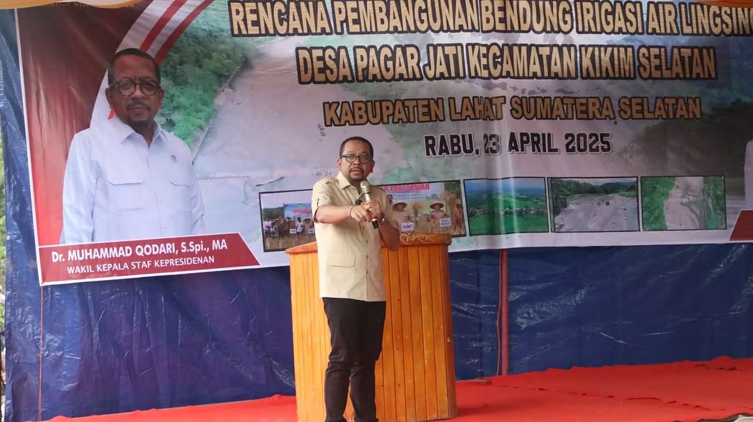 TEBARKAN – LAHAT – Wakil Kepala Kantor Staf Kepresidenan (KSP), Muhammad Qodari, melakukan agenda kunjungan kerjanya di Kabupaten Lahat, Sumatera Selatan, dengan meninjau langsung pelaksanaan peletakan batu pertama pembangunan irigasi teknis di Sungai Lingsing, Desa Pagar Jati, Kecamatan Kikim Selatan, kabupaten Lahat, Sumatra Selatan pada Rabu (23/4/2025).
