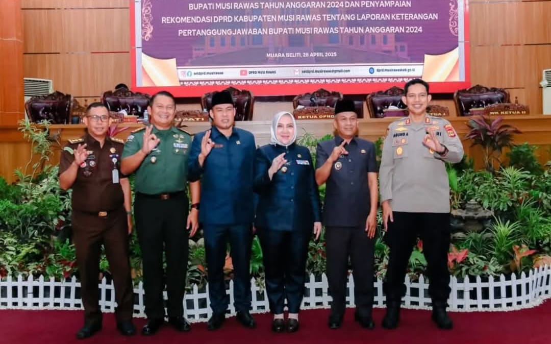 Paripurna DPRD Kabupaten Musi Rawas dalam rangka penetapan keputusan atas rekomendasi LKPJ Bupati Musi Rawas Tahun Anggaran 2024 berlangsung khidmat dan dihadiri langsung oleh Bupati Musi Rawas, Hj. Ratna Machmud, beserta Wakil Bupati, H. Suprayitno. Sidang dipimpin oleh Ketua DPRD Musi Rawas, Firdaus Cik Olah, didampingi waka I Azandri.