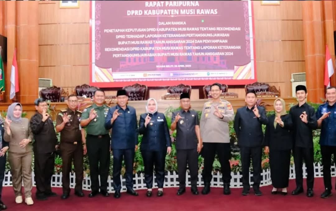 TEBARKAN – MUSI RAWAS – Rapat Paripurna DPRD Kabupaten Musi Rawas menetapkan rekomendasi terhadap Laporan Keterangan Pertanggungjawaban (LKPJ) Bupati Musi Rawas Tahun 2024 dalam Rapat Paripurna yang berlangsung di ruang Paripurna DPRD Musi Rawas, Senin (28/04/2025).